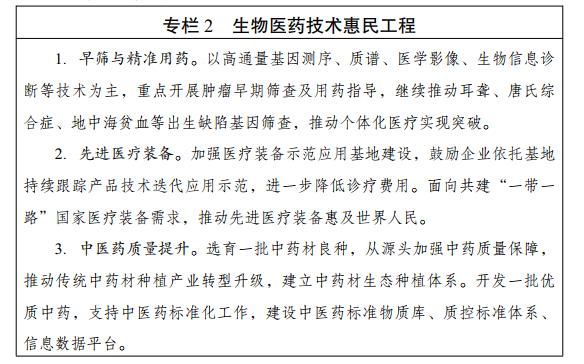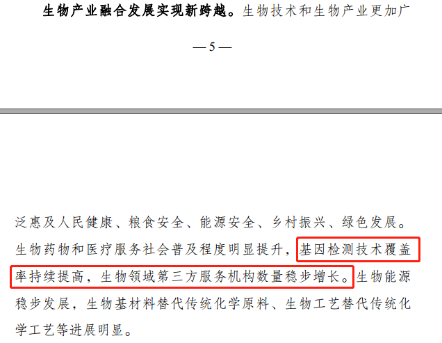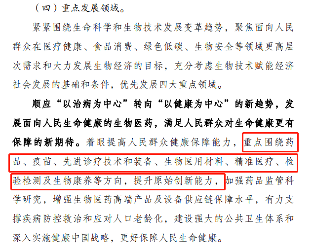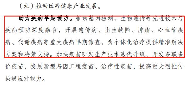 《规划》明确将满足人民群众“医、食、美、安”等新需求作为生物经济未来五年发展的重点领域,对医药健康产业发展作了专门部署,并多次提及体外诊断相关技术与产业发展方向。如总体要求中提出“基因检测技术覆盖率持续提高,生物领域第三方服务机构数量稳步增长”的发展目标,以及“重点围绕药品、疫苗、先进诊疗技术和装备、生物医用材料、精准医疗、 检验检测及生物康养等方向,提升原始创新能力。”