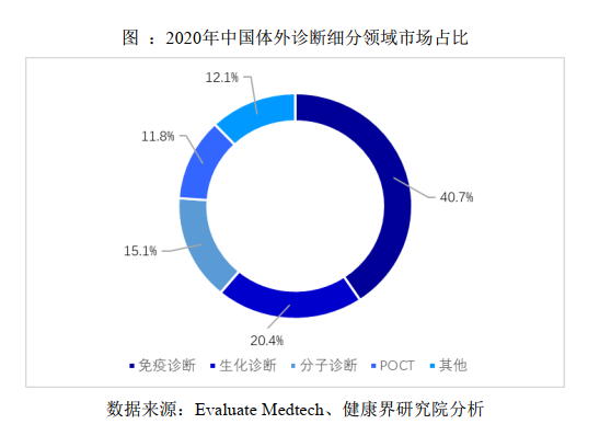 根据Evaluate Medtech数据,2020年国内IVD细分市场中,免疫诊断是占比最大,达到40.7%,主要包括化学发光、酶联免疫、胶体金、荧光免疫等等,免疫诊断板块的增速较高,预测未来几年免疫诊断国内市场增速将维持20%左右;近两年分子诊断因新冠病毒核酸检测巨大的市场需求而呈现爆发式增长, 2016年-2020年复合增长率达29%,2020年占IVD市场份额比15.1%,预计国内分子诊断市场规模将维持29%的增速, POCT市场规模将维持20%左右增速。