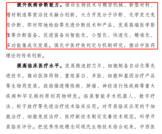提升疾病诊断能力。推动生物技术与精密机械、 新型材料、增材制造等前沿技术融合创新, 大力开发分子诊断、 化学发光免疫诊断、 即时即地检验等先进诊断技术和产品,发展高端医学影像等诊断装备, 促进装备向智能化、 小型化、 快速化、 精准化、多功能集成化发展。