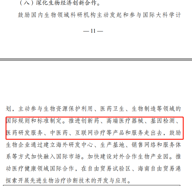 推进创新药、 高端医疗器械、基因检测、医药研发服务、 中医药、 互联网诊疗等产品和服务走出去, 鼓励生物企业通过建立海外研发中心、 生产基地、 销售网络和服务体系等方式加快融入国际市场。