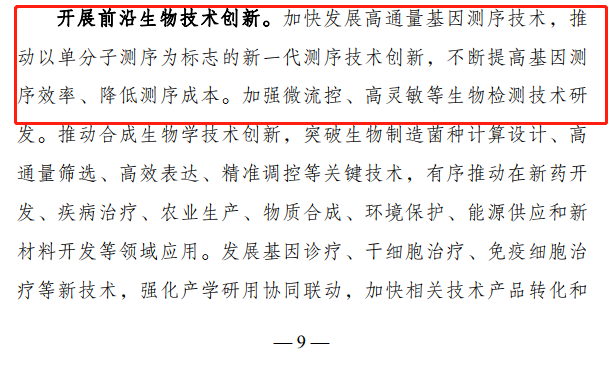 《规划》提出要开展前沿生物技术创新。加快发展高通量基因测序技术, 推动以单分子测序为标志的新一代测序技术创新, 不断提高基因测序效率、 降低测序成本。加强微流控、 高灵敏等生物检测技术研发。
