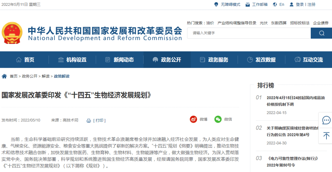 5月10日,国家发改委对外发布了《“十四五”生物经济发展规划》,对“十四五”期间生物产业作了系统规划。